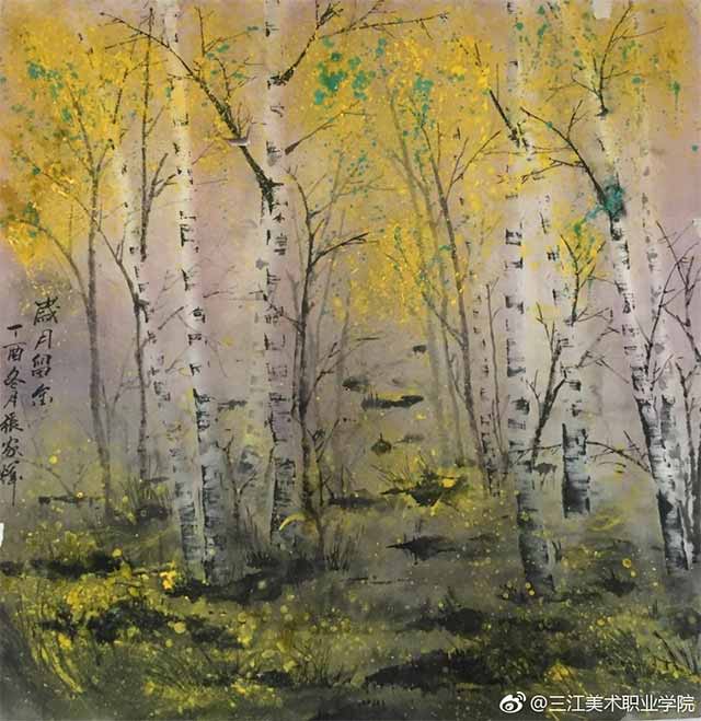 金红炜作品《诗意秋色永恒》获高校教师组二等奖,马兆玉作品《秋实》获高校教师组三等奖,王惠琪作品《乌斯浑河的深秋》获高校教师组三等奖;美术教育专业大一学生张家辉的作品《岁月留金》获高校学生组三等奖。