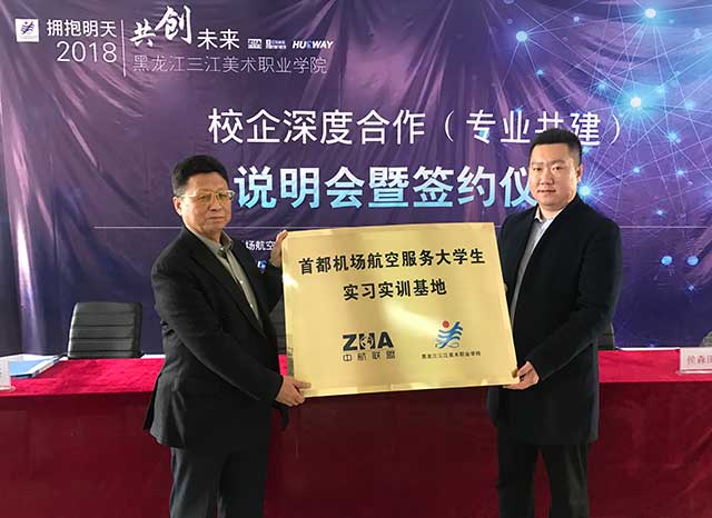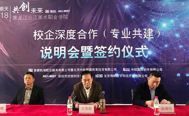黑龙江三江美术职业学院校长王英海介绍到,为认真贯彻落实十九大精神,积极响应国家关于“产学合作,协同育人”的号召,推动高等院校教学改革,加快民航事业发展,培养优秀民航专业人才,黑龙江三江美术职业学院与北京中航联盟教育投资有限公司本着优势互补、合作共赢的原则, 经友好协商,达成合作办学协议。北京中航联盟同意做为三江美院的大学生实习基地,由三江美院派遣实习学生,由中航联盟为其供实习机会和就业岗位,并将三江美院做为首都机场航空服务大学生实习实训基地。
