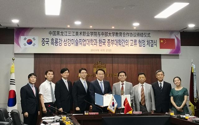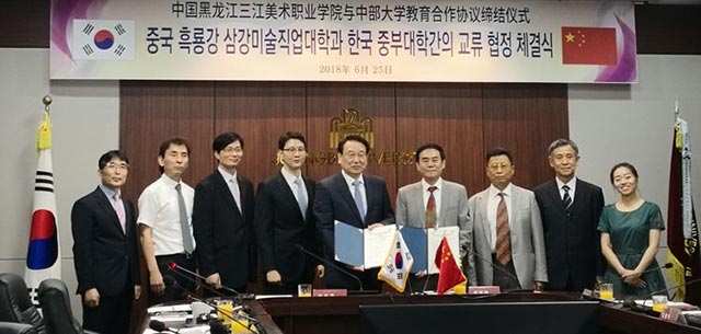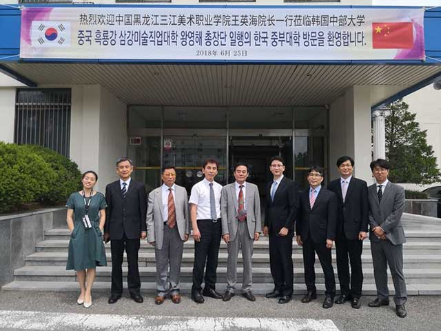 在中部大学总部综合办公楼上,挂上了专门为迎接黑龙江三江美术职业学院王英海院长一行的欢迎横幅,中部大学副校长李震烈、国际学院院长崔永模教授、副院长奇化龙教授等与三江美院院长王英海教授、副院长鞠剑锋教授、副院长金红炜教授、学院国际部负责人王明月女士在门前合影。