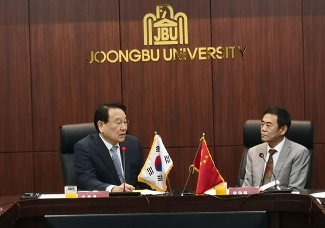 韩国中部大学洪承湧总长(校长)与中国三江美院院长王英海教授在签约中交流合作办学的意见。