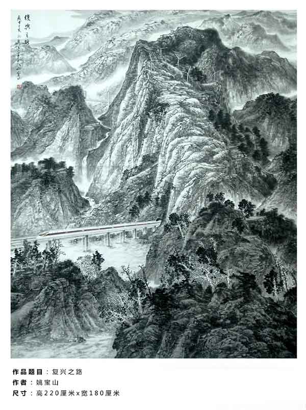 姚宝山老师创作的国画作品《复兴之路》被评为优秀奖,足以令全省所有美术工作者尤其是中国画爱好者羡慕和追捧。这幅作品主要表现了作者内心对祖国壮丽山河的热爱和民族复兴的自豪感,充分展现了新中国成立70周年、特别是改革开放40年来中华大地发生的翻天覆地的变化。画面的主体是一列我国自主研发的复兴号列车奔驰在广袤的大地上;远处,山势起伏,层峦叠翠,新能源风力发电设备源源不断地为人民生活输送电力,保驾护航。同时,国画还体现出习近平总书记提出的"绿水青山就是金山银山"的新发展理念。整篇作品大气厚重、气势磅礴,完全达到了国家级水平和参加国家画展的标准。
