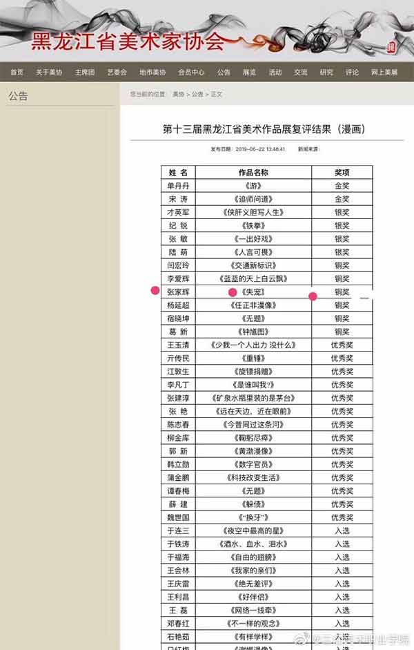 黑龙江省第十三届美术作品展览是由中共黑龙江省委宣传部、省文化和旅游厅、省文联、省美术家协会为庆祝中华人民共和国成立70周年而共同主办的全省最高级别的美术作品展览。本次展览共征集到中国画、油画、漫画、动漫等11个美术门类近3000件作品。各门类评委会遵循公平、公正、公开的评选原则,按照既定规程,评定产生了获奖作品428件,入选作品704件。其中漫画类作品金奖两件、银奖四件、铜奖六件。张家辉同学能够在近千件入选作品中获得前十名的好成绩,确实是非常不容易的。