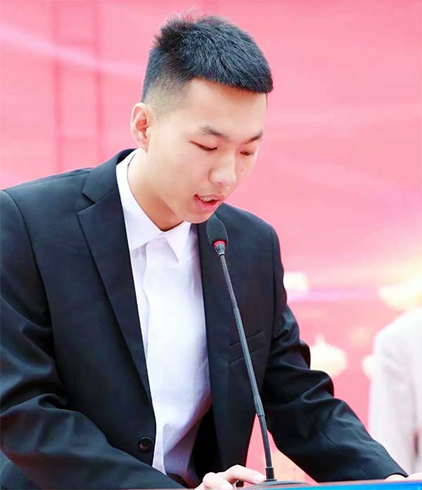 大会第五项2018级环艺专业白坤作为老生代表进行发言,他表示,一年前的这个时候,他也曾跟大家一样,作为一名新生,怀揣着自己的梦想和希望,来到美院学习,如今,我已经是一名大二的学生,没有了当初的幼稚与天真,经历了一年的磨练与打拼,已变的成熟了许多。进入学校的第一件大事,当然就是军训,作为学长,我要告诉大家,军训过后,意气风发的你们将开始新的征程。“大浪淘沙,方显真金本色,”时光如白驹过隙,青春短促,未来的道路就在前方,面对新的征程,让我们勇往直前,在三江美院这一片广袤的天空下,像雄鹰一样展翅翱翔。