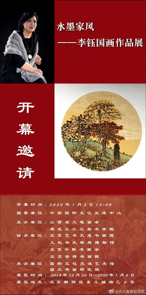 2020年1月2日,由中国国际文化交流中心指导,山西省工笔画会、黑龙江三江美术职业学院主办,北京艺术天成书画院、九牧林氏家具博物馆、北京中韩书画会、北京世侨书画院协办,国际文化交流艺术馆、国立书画研究院承办的“水墨家风——李钰国画作品展” 在中国国际文化交流中心国际文化交流艺术馆举办,来自文化艺术界的领导及艺术家近百人出席了开幕式。此次共展出李钰近年精心创作的代表作品60多幅,这些作品表达了作者对祖国美丽山河的赞美之心及对传统家风的敬仰之情。