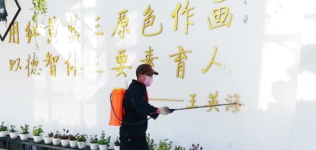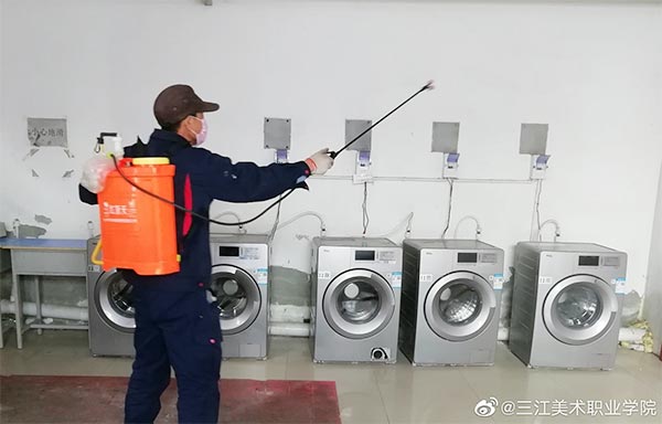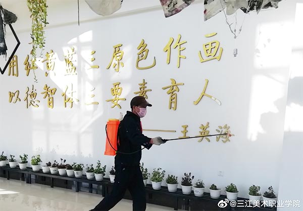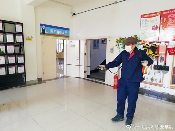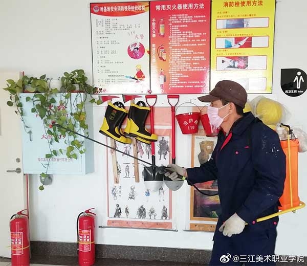 自学院1月23日启动新型冠状病毒感染的肺炎疫情防控工作后,三江美院安全保障处及时指导督促资产科储备消毒物资、开展消毒工作。2月3日,黑龙江三江美术职业学院党委书记王少青、院长王英海就新冠肺炎疫情防控工作召开碰头会与学院当天下发的《关于进一步做好疫情防控工作的通知》文件后,哈尔滨教学实习基地立即对校区的办公空间、值班室、大门门岗室、物业值班室、水房、洗手间和师生公寓等地点进行防疫消毒工作。消毒以化学消毒与自然通风相结合的方式进行,物业部门也积极做好各服务区域化学消毒及消毒液储备、消毒器械准备、消毒人员安排等事宜,每天对相关公共空间的地面、墙面、桌面等进行喷洒和擦拭消毒作业。