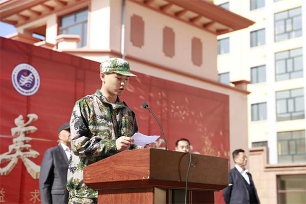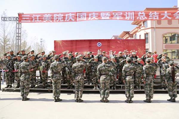 在获奖新生接受表彰之后,到了新生、老生代表发言的环节。来自2020级环艺系的苏奇堃同学说:“虽然只是短短的一周军训,却让我懂得、学会、拥有了许多,这是我在三江美院上的第一堂最完美、最充实的教育课,相信在今后的大学三年学习生涯中,我们一定会发扬在军训中养成的优良品质和作风,努力提高自己,在学习上和道德品质上给家长、老师,更给自己交上一份满意的答卷。”2019级环艺系的肖雨妍同学在发言中谈到:“一周的军训虽然结束了,但是,我们新的人生阶段才刚刚起步,在军训中我们学会了去勇敢的面对一切困难,并且用智慧与毅力来克服;学会了挑战自我,超越自我,这对于我们今后的学习生活是一个良好的开端,我们要在今后的学习中发扬这种精神,不断向着目标迈进。”
