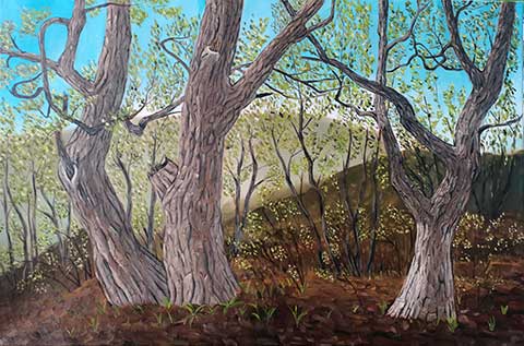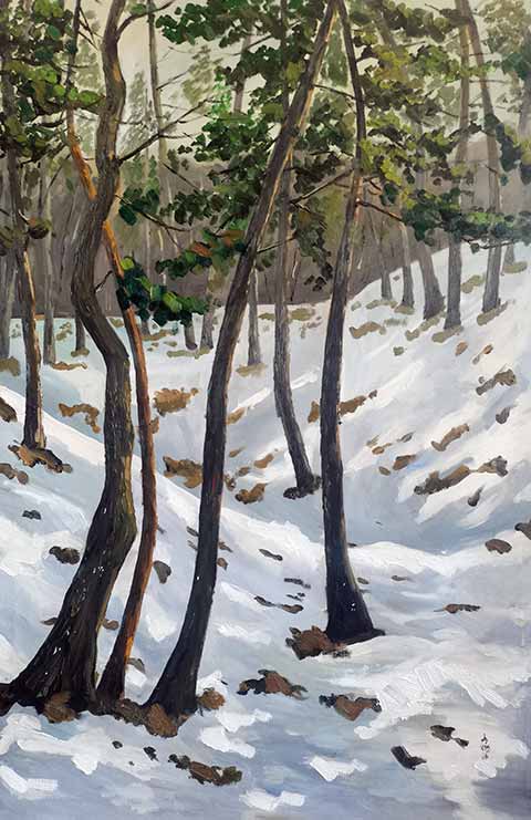 冉鹏帅同学创作的作品名叫《冬日的山谷》(60cm×90cm),他在谈到这幅作品的创作初衷时说:“立德树人”是老师的任务,作为美术教育系的学生,我打算画一幅以“树”为主题的画;考虑许久,画下了这幅《冬日的山谷》。美术教育系副主任郭勇这样评价这幅作品:这幅作品中的树,不同于其他粗枝大叶的树,这幅画里的树很细,细到树纹都很难画上去。稀疏的雪地上,几颗郁郁葱葱的小树枝繁叶茂,与天寒地冻有点格格不入,但又让人感觉很融洽,有种冬去春来、万物复苏的感觉。绿油油的树、白皑皑的雪,这些生机勃勃的景象就是作者想要表达的主题思想。