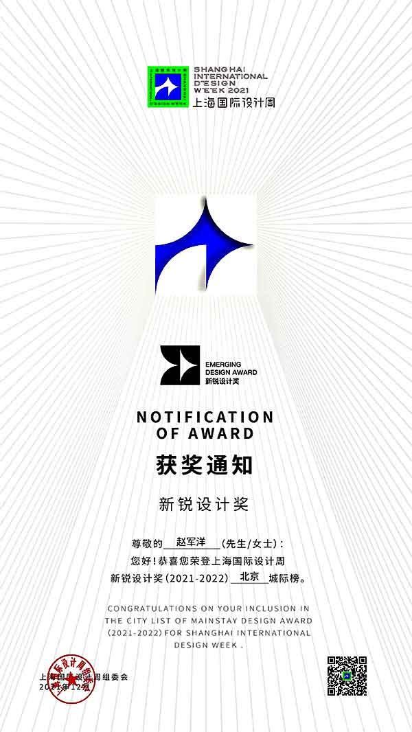 近日,上海国际设计周官网发布了本届国际设计周比赛结果,由黑龙江三江美术职业学院教师张怀南、曹红宝指导的2020级学生赵军洋的室内设计方案《北麓雅苑》荣登上海国际设计周新锐设计奖(2021-2022)北京城际榜,由上海国际设计周组委会向获奖者颁发了“新锐设计奖”证书。