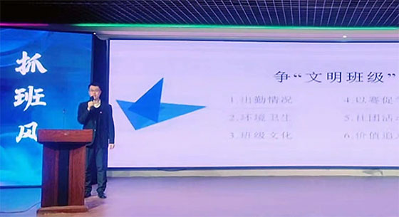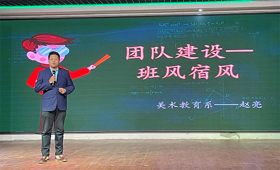 2021级美术教育2班辅导员赵亮老师在发言中详细阐述了他所带的班级在团队建设、制度建设等方面的诸多好的做法。