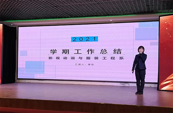 李彤主任代表影视动画与服装工程系做了《2021年度工作总结与新学期工作计划》的汇报,从“人才培养”“创新教学”“以研促教”“教学成果”“以赛促学”等几个方面对全系本学期重点工作进行了简要的总结。