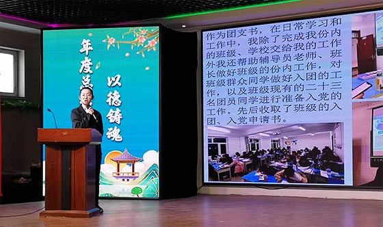 会议第一项议程是美教系各班学生代表发言。2021美教1班的孙艳蕾、2021美教2班的王婉婷、 2020美教油画班的朱加鑫、2020美教学前班的宋乾圆和2020美教国画班的史春泽等5名同学先后走上舞台,以PPT大屏幕声像结合、图文并茂的方式,向与会人员汇报了一个学期以来他们在学习、生活、管理、社团活动等方面取得的进步和成绩。