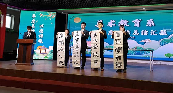 美育专业群是我院重点打造的专业群,也是我院具有37年办学历史的传统专业群。专业群设立以来,培养了数千名美术教育工作者。在今天的总结会现场,朱振宇、邹韵两位老师带领学院书法社团成员张鹏羽、刘美琪共同创作了书法作品“真诚学知识,真切学做事,真实学做人,真情为人民”。师生们娴熟的笔法、精湛的技艺令现场观众耳目一新、啧啧称赞。美教系底蕴深厚、人才济济,果然名不虚传。