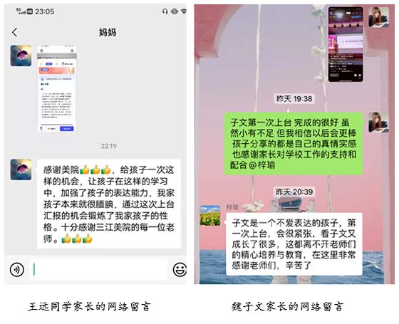 最后汇报的是数字传媒系的学生王英杰。王英杰同学在学习与应用中找到了一定的规律,在做中学,在学中做,学以致用,成果明显。主持人对王英杰的评价是:思想积极向上,振奋人心,汇报内容丰富,整体表达通顺,主次分明,以成果为主,其他为辅。王英杰的家长在观看直播后留言说“学院的专业水平强,教得很好,学生进步明显,也感谢学校给孩子这样一个展示自己的机会”。