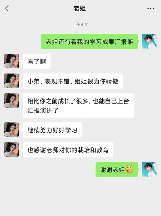 王天一同学的汇报落落大方,经验丰富,振奋人心;肢体语言简洁得体,学习成果十分突出。她的汇报语言通畅,层次分明,节奏感掌握得当。