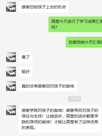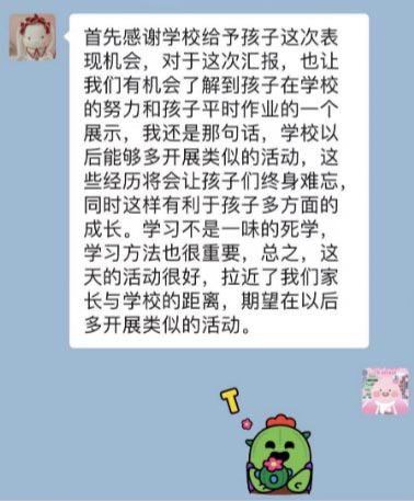 毛鑫雨的家长在观看直播后留言说:“通过学校这次活动,让我了解了孩子在美院的表现,心里非常有底,感谢学院让孩子有这次机会上台展示自己。孩子在学真真切切的学到了东西。”