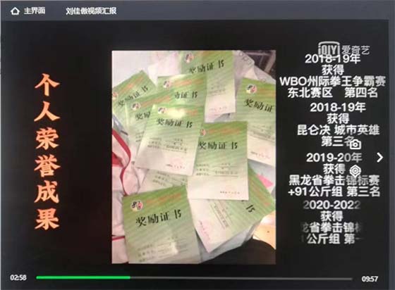 在当天的成果汇报会上,他以视频的形式介绍了自己的家乡——大庆,介绍了自己在拳击运动中获得的荣誉,有创新、有想法。他还特别把三块奖牌带到现场。这也是他生命中最重要的三块奖牌。