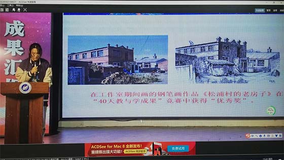 ▲ 李悦萌同学展示她的钢笔画作品《松浦村的老房子》