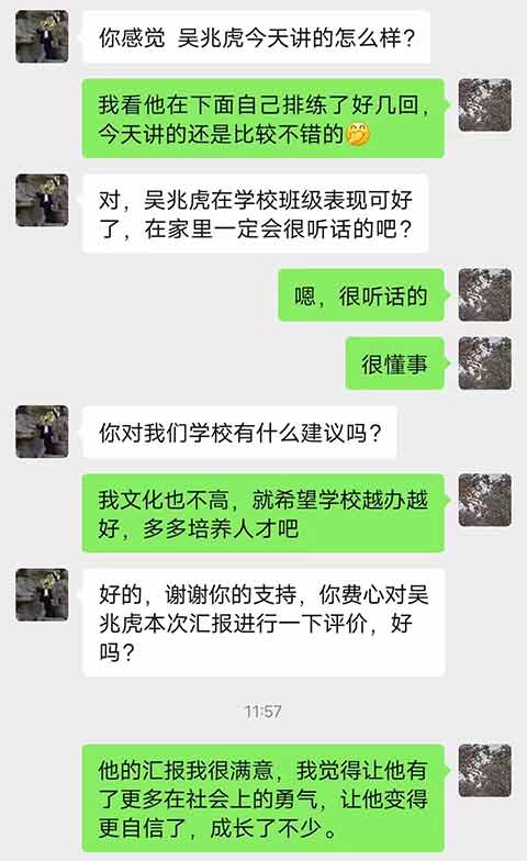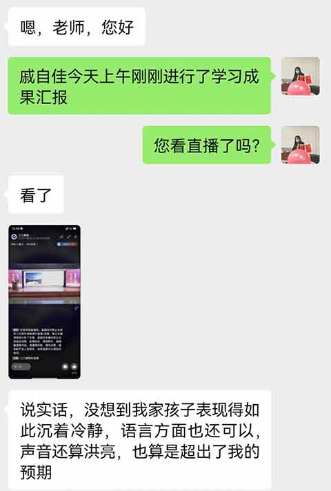 赵治洋的家长在收看直播后留言说:“这个学期,你从老师和同学那里得到的信任给你提供了一个为班级服务并有所作为的机会。这不仅让你变得坚强,也让你变得成熟。在学习中,你逐渐懂得合理安排时间,使自我有更多的时间做自己感兴趣的事情,使业余时间变得丰富多彩。父母希望你保持良好的阅读习惯,扩展你的知识面,提高你的修养”。