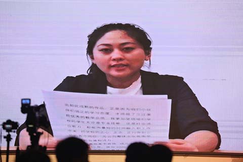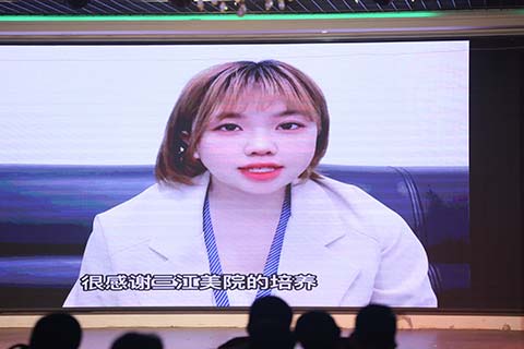 正如王经理所说,三江美院培养的人才在公司能快速适应岗位需要,深受用人单位的欢迎。在本次汇报中,经过一年实习即将毕业的李凯同学通过视频与汇报会现场做了交流。经过一年的历练,李凯同学明显成熟了很多,但同时她还保持着在校学习时的初心。她首先分享了自己的实习心得和体会,然后对即将实习的同学提出了建议,并表达了对学校和老师的感激之情。