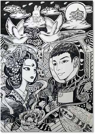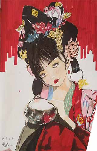▲ 蒋鑫的手绘图 ▲ 蒋鑫的蜡染刺绣作品