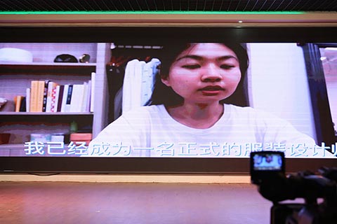 汇报会主持人特别邀请到了2019级服装班的章雪岩同学参加汇报会。他在大一和大二时任服装班班长,大三开始在嘉合服饰广州有限公司工作至今。今天她将与同学们分享她的工作经验。她说:“由于很喜欢服装设计这个专业,所以大三时独自一人到了广州,进入了嘉合服饰广州有限公司。第一次与社会接轨,感受到了学校注重实践教学的重要性。现在已经转正,目前薪资待遇7000元左右,希望学弟学妹们能够坚持梦想,早日成才。”