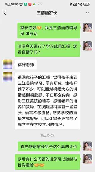 冯跃昕同学的家长在收看直播后给辅导员老师发来了很长一段留言,对线上学习期间该同学的出色表现表示肯定。他说:本学期因为疫情原因,冯跃昕一直被迫留在家中学习,作为他的父亲,刚开始我还很担心,后面渐渐地发现,冯跃昕的自制力还是很强的。每天都能按时打卡上网课,网课期间能专心跟着老师的节奏走,认真做笔记,踏踏实实的完成每一次学习任务。在课余时间,也更富有责任心和担当,会主动承担部分家务,积极与家人谈心交流,沟通能力也强了很多,不会因为一些小事而愁眉苦脸,更加的乐观开朗。看到这些改变,我很欣慰,孩子能有如此大的进步,离不开老师的辛勤付出和耐心指导,同时也非常感谢学校与领导的栽培。盛年不重来,一日难再晨,希望冯跃昕可以珍惜自己宝贵的青春年华,志不强者智不达,言不信者行不果,在未来的学习生活中,冯跃昕应该更加坚定意志,紧紧跟随老师的步伐,博学之,审问之,慎思之,明辨之,笃行之,争取能为社会、为国家献一份自己的力量。