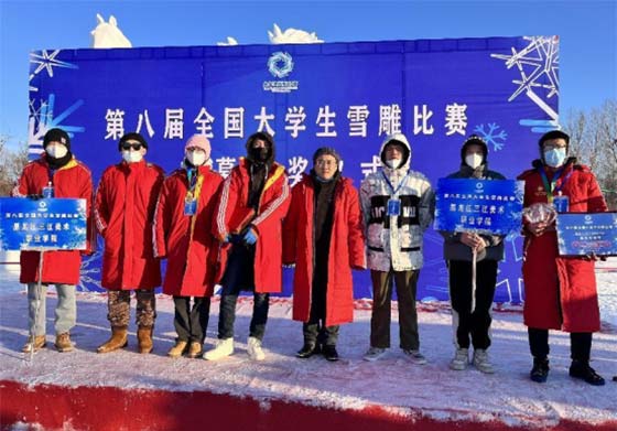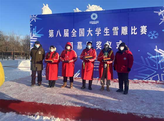 ▲三江美院师生在全国大学生雪雕比赛闭幕式上