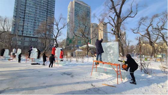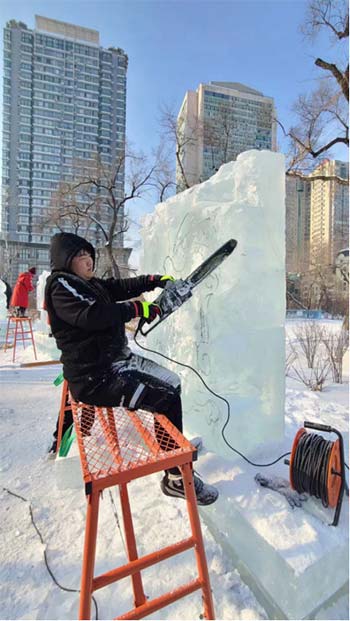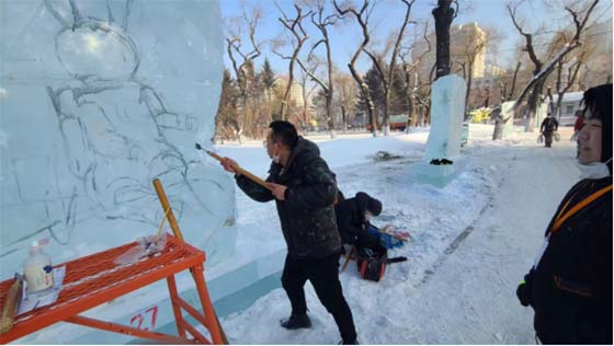 黑龙江三江美术职业学院各代表队以“冰魂舞动新时代”为主题,运用切、旋、削、刻等手法,在长1.5米、高2米、厚0.5米的整体固定天然冰上开展冰雕创作。