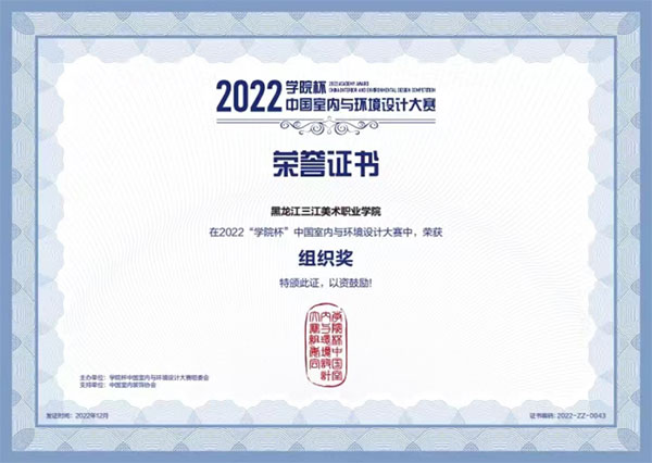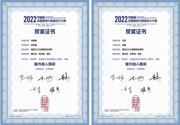 近日,“2022学院杯中国室内与环境设计大赛”组委会发布比赛结果,由黑龙江三江美术职业学院北京教学基地教师曹红宝、张怀南和吴琼老师指导的2021级3班学生取得优异成绩。黑龙江三江美术职业学院荣获“学院杯”组织奖,李桂蓉同学的作品《怡然居》荣获室内组入围奖;王菲同学的作品《简逸》荣获室内组入围奖。
