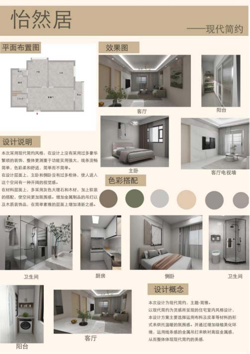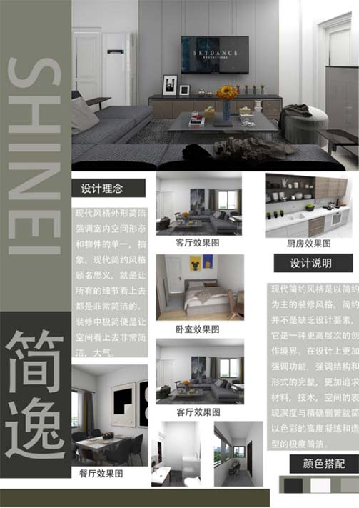 在三江美院李桂蓉同学设计的方案中,设计定位为简约风格设计,以现代简约为灵感呈现住宅室内风格。在设计上没有采用过多豪华繁琐的装饰,整体更侧重于功能实用、强大,线条流畅简单,色彩柔和舒适,简约而不简单。