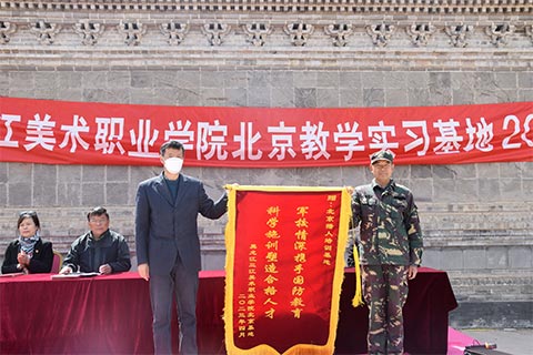 三江美院院长助理、北京教学实习基地主任江天代表所有参训学生向八达岭军训基地主任潘洪友赠送了锦旗。