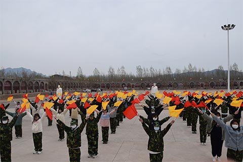 海军旗语表演同样气势非凡。同学们伸出双手,挥舞黄、红两色旗帜,表达出十几种不同的海上交流寓意,宛如是在激励自己奋勇前进。