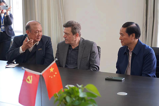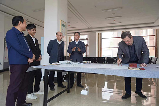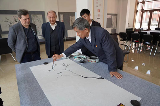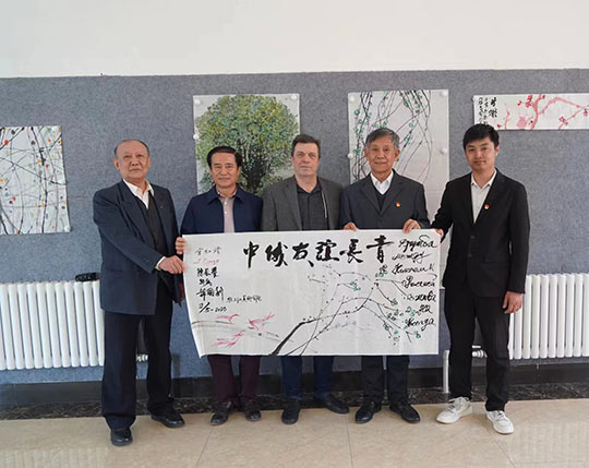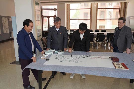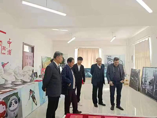 2023年5月9日下午,俄罗斯功勋文化工作者、国立麦罗沃文化艺术大学德罗兹德•安德烈•尼古拉耶维奇教授在黑龙江省俄罗斯油画交流研究会会长陈凤跃等一行陪同下,应邀来到黑龙江三江美术职业学院哈尔滨教学实习基地访问并洽谈合作,在学院副院长金红炜教授、美术教育系执行主任郭勇等陪同下,先后参观了龙美书院和学院美术教育系的师生作品展陈。在美术教育系,双方还就就中俄高等美术院校的教学和绘画创作等问题进行了交流。在龙美书院书画工作室,中俄五位艺术家在画案宣纸上分别挥墨点彩,合作绘制了一幅题为“中俄友谊常青”的书画作品,通过不同的绘画语汇,艺术地表达了两国艺术家对中俄人民友谊的美好祝愿。