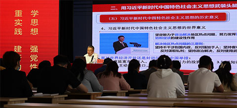 王少青从三个方面习近平新时代中国特色社会主义思想是实践中形成的科学理论;用习近平新时代中国特色社会主义思想武装头脑、指导实践;做新时代合格的教育工作者,在引导规范中推动高质量发展深刻讲解了习近平新时代中国特色社会主义思想精神实质和核心要义。