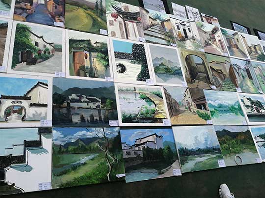 同学们创作的作品以班级为单位进行陈列,其中包括素写、水彩画、水粉画、丙烯画等四大类以及摄影、书法作品。已经在宏村售出的作品则以打印彩色照片的形式参加展出。