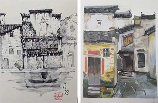 ▲李智同学创作的《宏村月沼》 ▲张子慧同学创作的《建筑风景》