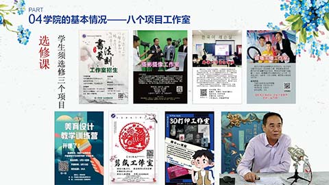 王英海院长说,新生入学后一定要慎重选择专业,以便于日后学习和就业。学生在学好专业课的同时,还需要选择三个选修项目课程进行学习。学院设有书法篆刻工作室、摄影摄像工作室、韩语工作室、直播主播工作室、美育设计教学训练营、剪纸工作室、3D打印工作室、掐丝珐琅彩等八大项目工作室。很多学生在工作室完成的作品都能实现“作业变作品,作品变商品”的目标。我院还设有龙美书院、龙美画院、龙美教育、龙美设计、龙美稚苑、龙美信息等六个实体平台,供同学们参与教学和社会实践。