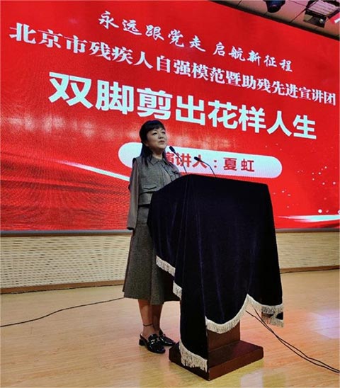 全国优秀共产党员、全国自强模范夏虹重返母校、登台演讲,以一句“我回家了!”作为开场白,深深打动了现场在座的每位师生。她以《双脚剪出花样人生》为题,向师生们讲述了她7岁时,因为意外失去双臂,但她却以顽强的精神和毅力克服困难,刻苦学习剪纸技艺,用双脚剪出了美丽人生,成为北京榜样人物的故事。她从事公益事业10余年,带领团队为残疾人和社区老人提供志愿服务5万余人次,开展技能培训5000多人次,帮助600多名残障人士重拾生活信心。每年都坚持为青少年开展励志演讲,用实际行动践行了优秀共产党员的初心使命。