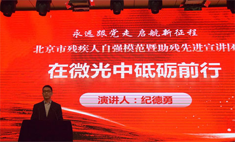 全国自强模范纪德勇在一次演习中不慎接触化学烟雾,双眼几近失明。20多年来,他自立自强,钻研中医,创立了“纪师傅中医保健按摩”品牌。此外,纪德勇及其团队帮扶困难群体,协助安置残疾人就业,帮助残疾人学手艺,救助残疾、孤老、贫困群体。铮铮硬骨的纪德勇砥砺前行,用光明回报社会。他讲述的《在微光中砥砺前行》的故事,使不少聆听报告的师生流下了感动的泪水。