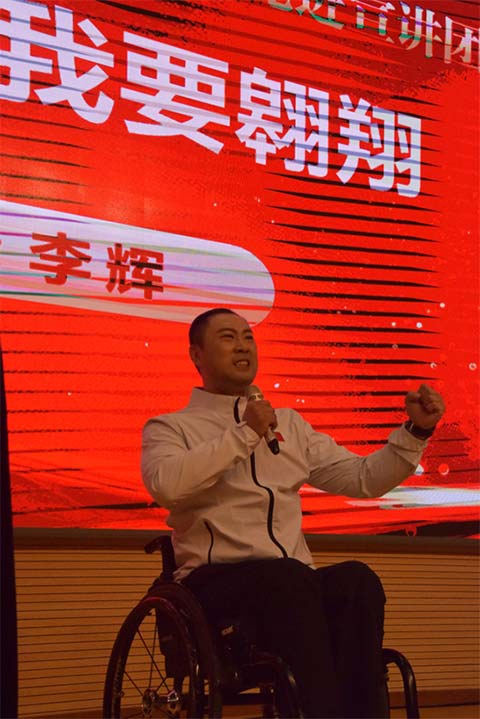 全国自强模范,北京市朝阳区心之源艺术康复服务中心创始人李辉,以《我是鸿雁,我要翱翔》为题,讲述了他2012年因意外受伤后继续在轮椅上舞动,为全国轮椅使用者编排健身舞《小苹果》火遍全国的故事。2018年至今,他为朝阳区共培养出110名轮椅健身舞骨干学员,轮椅独舞《归来》代表北京市残联代表队参加第十届全国残疾人艺术汇演,荣获表演一等奖;他本人2020年被评为北京榜样十大年榜人物。其个人事迹被央视 CCTV1《机智过人》、CCTV3《向幸福出发》、CCTV13《面对面》、北京卫视、人民网、新华网、中国日报,北京日报以及“学习强国 ”客户端等多家媒体报道。他精彩的报告赢得了在座师生的不断喝彩。