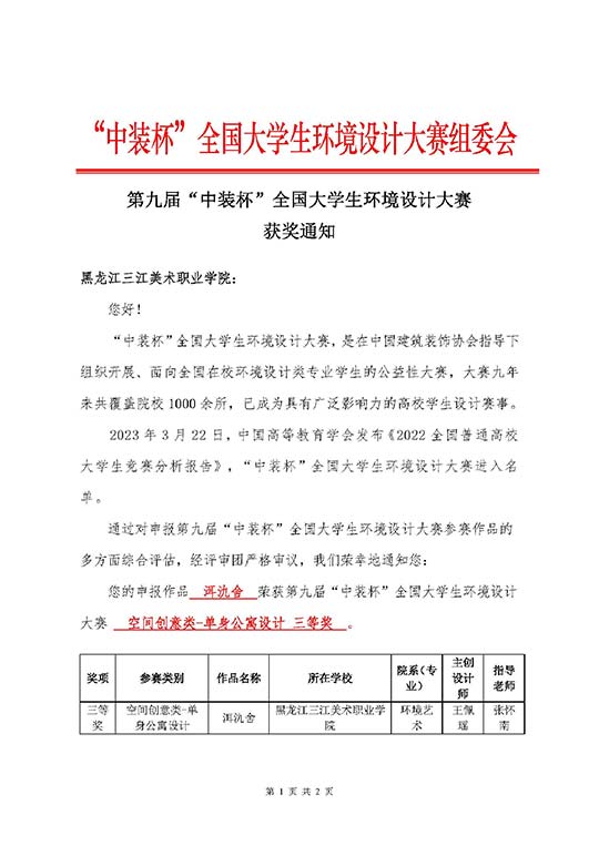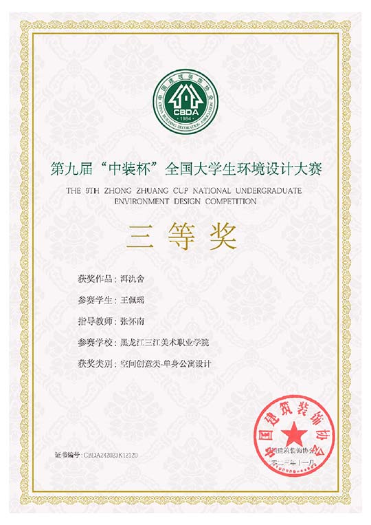 近日,第九届“中装杯”全国大学生环境设计大赛结果揭晓,黑龙江三江美术职业学院北京教学实习基地环境设计专业2021级1班学生王佩瑶荣获三等奖。