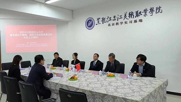2023年12月20日下午,韩国灵山大学部长咸正午教授、国际合作处中国主任崔真真女士应邀到三江美院北京教学实习基地交流访问,双方在北京教学实习基地举行国际合作协议签订仪式。我院理事长、院长王英海,北京基地党支部书记、综管办主任丁春生,北京基地教研办执行主任薛明儒,北京基地韩语教师李忻殊参加签订仪式。签订仪式由我院副院长金红炜主持。