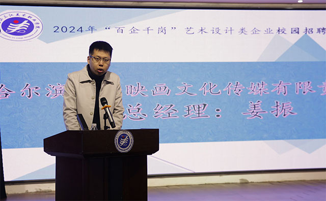 校企合作单位代表、哈尔滨一泽映画文化传媒有限公司总经理姜振,哈尔滨市得亨印刷有限公司设计部经理王英杰,黑龙江亿居装饰工程有限公司运营总监张玉泉作为校企合作单位代表在会上分别致辞,对三江美院毕业生加盟表示欢迎,对双方进一步深化校企合作提出希望。