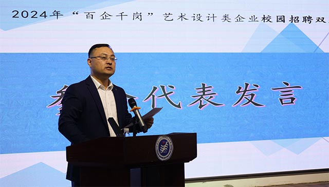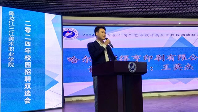 上台发言的哈尔滨市得亨印刷有限公司设计部经理王英杰具有双重身份,既是企业的代表,又是三江美院2022届的校友。他的发言充满了对母校领导和老师的敬意,也对师弟师妹未来的职业规划和就职选择给出中肯的建议。他言辞诚恳,热情大方,重返母校后的激动之情溢于言表。
