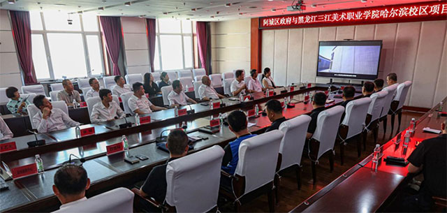 7月25日,黑龙江三江美术职业学院哈尔滨校区项目签约仪式在阿城区政府会议室举行,学院理事长、院长王英海教授,学院副院长梁晓勃以及我院各部门负责人共赴阿城区参加签约仪式。阿城区委副书记、区长白鸿亮,阿城区人民政府副区长邹永强、王殿友以及区企投局、发改局、教育局、资规局、住建局、土地征收中心、电业局、料甸街道、哈东供热有限责任公司、中燃燃气发展有限公司等相关部门领导共同参加签约仪式。