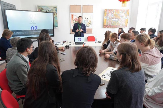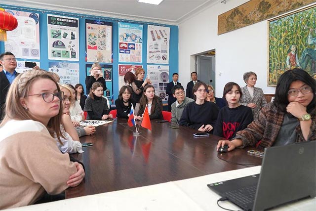 揭牌仪式后,中俄两国学生走进“开物工坊”教室,聆听三江美院赵少鲁博士和黑龙江全科创意设计有限公司驻俄代表王一老师的课程讲授。
