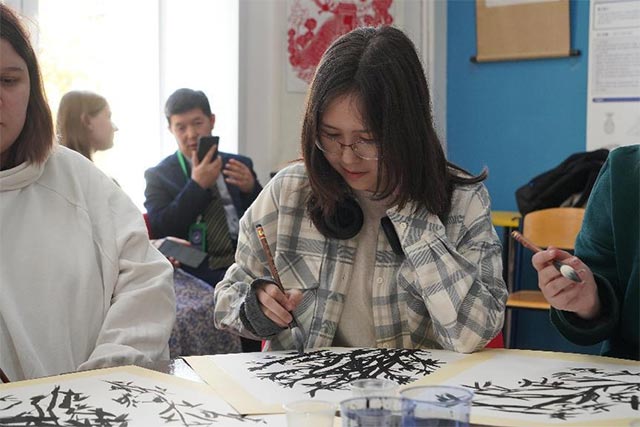 赵少鲁博士以“汉语+AI书画艺术”为主题为俄罗斯学生授课。本节课中,赵博士主要讲解了竹子的绘画技巧,竹子的绘制有其独特的艺术魅力。画竹的首要步骤是立竿,竿的起始便奠定了整幅画的基调。淡墨常用于粗竿,笔触需挺拔有力,竿身直上而下,流畅无阻,不得迟滞。随后以稍浓之墨点缀分枝。小枝虽常被竹叶覆盖,但其位置却决定了竹叶的布局。因此绘制时亦需细心。竹叶的描绘则以“个”与“介”字为基础,但不可过于刻板,需讲究排列与变化,以展现其生动之态。