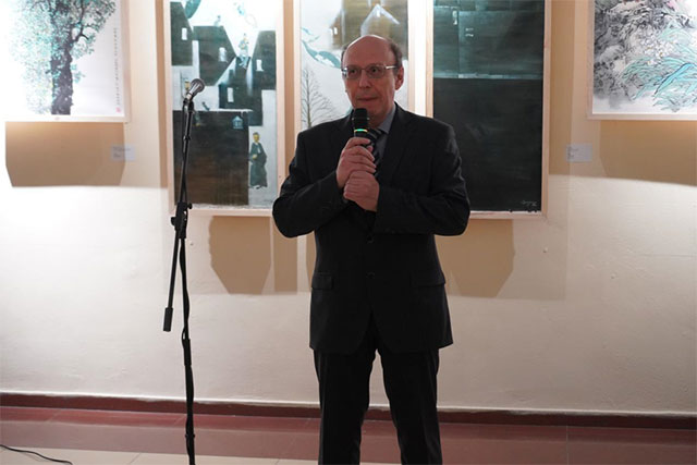 黑龙江三江美术职业学院理事长、院长王英海教授致辞,他说,2024年中俄青年艺术家作品国际展览不仅是一场艺术的盛会,更是中俄两国文化交流的重要时刻。中俄两国都是拥有悠久历史和灿烂文化的国家,美术与设计作为文化的重要组成部分,承载着两国人民的智慧和情感。今天,我们在这里共同欣赏中俄艺术家的精美作品,感受不同文化背景下的艺术魅力,这是一件非常有意义的事情。