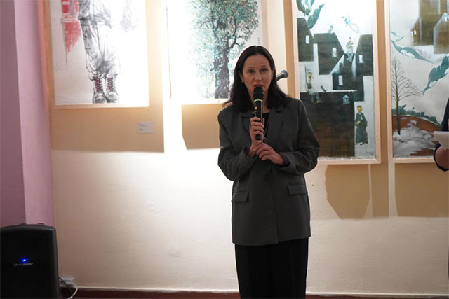 俄罗斯后贝加尔国立大学校长马尔腾诺科致辞,她首先感谢三江美院的师生不远千里来到俄罗斯参加中俄青年艺术家作品国际展览。2024年是俄中建交75周年,也是中俄新时代全面战略协作伙伴关系的深化合作之年。为增强两国人民之间的友谊,促进两国艺术家的交流互鉴,我校与黑龙江三江美术职业学院举办了这次展览。就是让中俄两国艺术家和学者切身感受多元文化的碰撞与交融,感受人类文明魅力,不断促进两国文化交流。