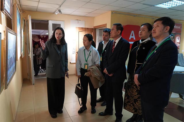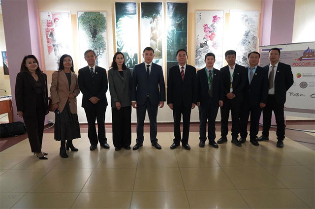 俄罗斯外交部驻赤塔市代表阿列玛索夫,俄罗斯后贝加尔边疆区副州长巴托木古耶夫,俄罗斯后贝加尔国立大学校长马尔腾诺科,黑龙江三江美术职业学院理事长、院长王英海教授,副院长金红炜教授以及后贝加尔国立大学师生代表、三江美院师生代表共同参观此次国际展览。